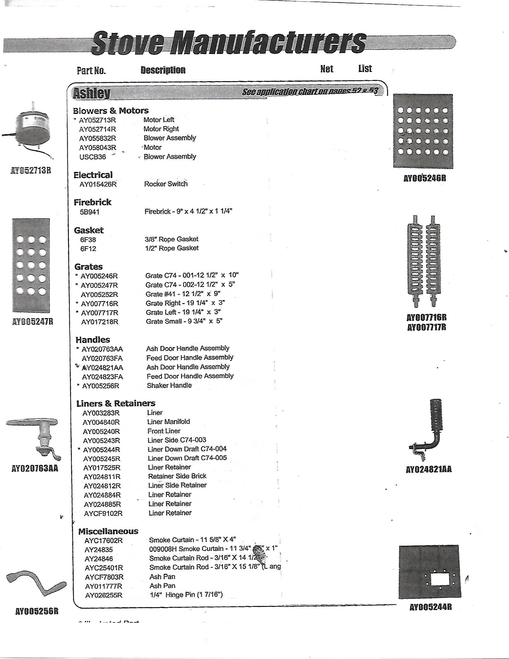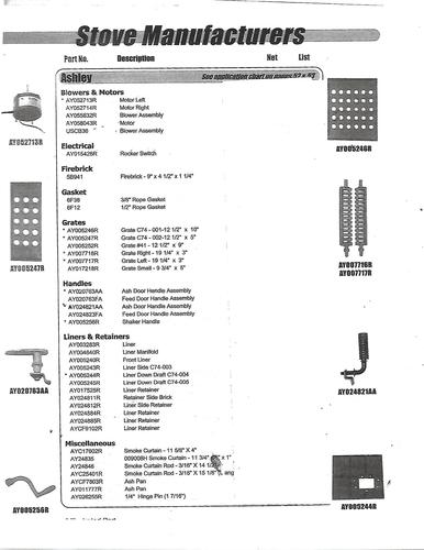 We have several parts available for the Ashley stoves! We offer replacement blowers and motors, grates, handles, liners and retainers, and misc parts! If you do not see the part you are looking for, call or email us.... We have parts available for most stoves!!!